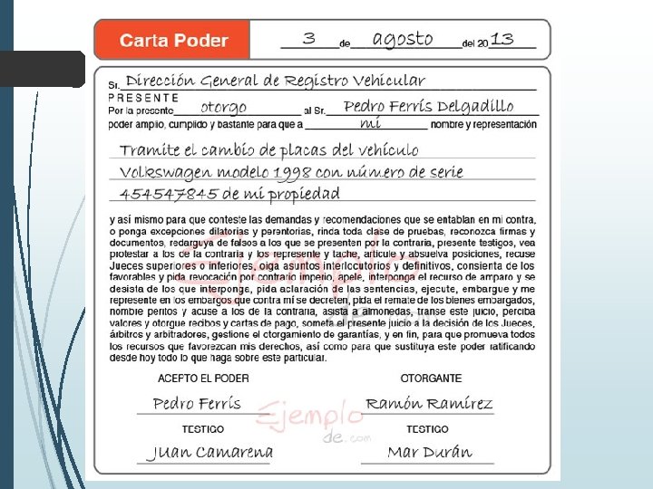 Carta Poder La carta poder se utiliza para facultar a un tercero a realizar cualquier tramite comercial, legal o administrativo en nuestro nombre, sin la necesidad de nuestra presencia física o nuestra firma, para cobrar un cheque, recoger nuestra credencial de elector en las casillas del INE. En el trabajo se utiliza para darle poder a los subordinados de realizar funciones sin la presencia del jefe. Las funciones o implicaciones deben venir bien delimitadas dentro de la carta poder, es decir, si vamos a permitir a un tercero realizar el cambio de propietario de nuestro automóvil, debemos especificarlo en la carta.