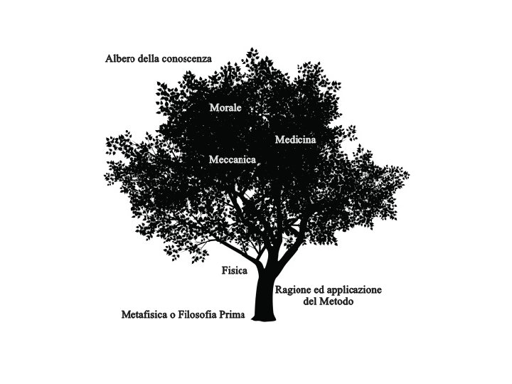 “Così tutta la filosofia è come un albero, di cui le radici sono la metafisica, il tronco è la fisica, e i rami che sorgono da questo tronco sono tutte le altre scienze, che si riducono a tre principali, cioè la medicina, la meccanica e la morale […]. Ora, come non è dalle radici, né dal tronco degli alberi che si colgono i frutti, ma solo dalle estremità dei loro rami, così la principale utilità della filosofia dipende da quelle delle sue parti, che non si possono imparare che per ultimo”. Quindi: bisogna far sì che l’albero abbia buone radici e sorga forte e sano (grazie al metodo); ma lo scopo è, alla fine, cogliere i frutti.