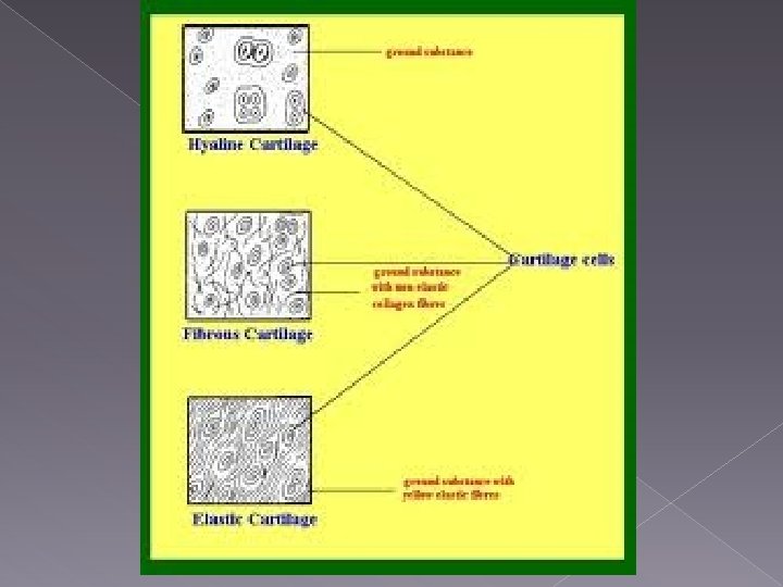 Matriz extracelular � La sustancia amorfa: Esta compuesta por proteoglucanos y glucosaminaglucanos principalmente Condroitín sulfato, Queratán sulfato y Ac Hialurónico. � Las fibras principales son: Colágeno tipo II (excepto en el cartílago fibroso que es cartílago tipo I), fibras elásticas, también se encuentran fibras de colágeno tipo IX, X, XI � El cartílago se puede dividir en 3 según las fibras que encontremos en la matriz C. Hialino, C. Elástico y Fibrocartilago.