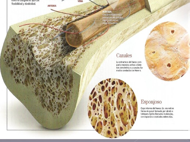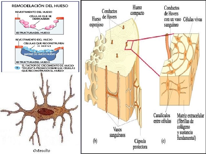� Los osteoblastos se encuentran en espacios denominados lagunas u osteoplastos. La matriz extracelular que rodea los osteocitos no está calcificada y se le denomina osteoide � Debido a que el resto de la matriz si está calcificada los osteocitos poseen una prolongaciones que pasan por unos pequeños espacios denominados canalículos, y se comunican unas con otras. (por este medio se pueden pasar nutrientes) � Los osteoclastos se encuentran en cavidades poco profundas en la superficie del hueso llamadas lagunas de Howship.