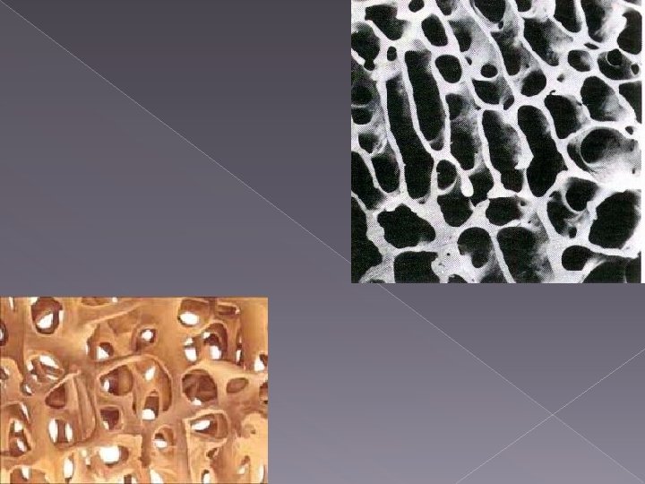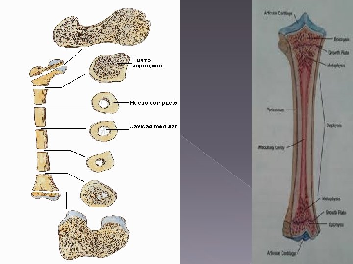 Organización macroscópica del tejido óseo � Macroscópicamente el tejido óseo se organiza en el hueso de 2 formas diferentes 1. Hueso esponjoso (hueso trabecular): Están formados por finos listones (trabéculas) que se entrecruzan en todas direcciones, formando una red esponjosa, cuyos espacios o huecos están ocupados por médula ósea 2. Hueso compacto o cortical: forma a simple vista una masa compacta sin espacios visibles.