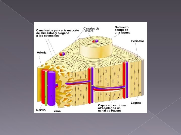 Hueso compacto (cortical) En el hueso compacto existen cuatro sistemas: � Láminas circunferenciales externas: Están justo abajo del periostio, contienen fibras de Sharpey que fijan el periostio al hueso. � Láminas circunferenciales internas: Análogas a las externas pero no tan extensas circundan por completo la cavidad medular. � Osteonas (sistemas de canales haversianos): se forman por cilindros de láminas, dispuestos de manera concéntrica alrededor un espacio neurovascular conocido como canal haversiano. Los canales haversianos se comunican entre si y con el periostio a través de canales transversales denominados conductos de Volkman � Laminas intersticiales: restos de osteonas degradadas