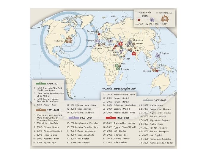 Le pays sous tension (1989 -2001) Kaboul Kandahar 1989 Un gouvernement islamique modéré laissé par les soviétiques subsiste 1992 Un chef de guerre tadjik prend le pouvoir 1994 Les Talibans, pachtounes, commencent à s’emparer progressivement du territoire Ils viennent majoritairement des madrasas pakistanaises 1996 Il mettent en place un régime fondamentaliste sunnite à Kaboul Le commandant Massoud fonde l’Alliance du Nord pour leur résister Ben Laden s’installe en Afghanistan pour financier les Talibans Al-Qaïda organise des camps d’entraînement pour former des djihadistes au terrorisme international 2001 L’assassinat de Massoud consacre la domination des Talibans à la veille de l’attentat de 11 septembre