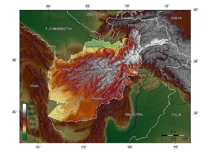 L’impact du cadre naturel Un massif montagneux-barrière, Des plaines plutôt arides en marges et peuplées Une ligne de crêtes avec des sommets > 4000 m Des vallées enclavées qui fragmentent le pays et renforcent sa structure tribale Une urbanisation faible et périphérique Des axes de communications peu nombreux