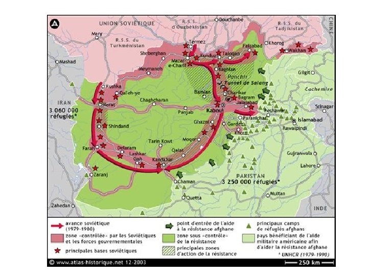 L’invasion soviétique (1979 -1989) Hérat 1978 Kaboul Coup de « Kaboul » : arrivée au pouvoir du PDPA marqué par des rivalités internes. Insurrections traditionnalistes contre les réformes du parti au pouvoir 1979 Invasion de l’Armée rouge Contrôle limité du pays par l’Armée rouge, « bunkerisée » et incapable de s’imposer Développement de la résistance (guérilla dans les zones montagneuses et périphériques) 1986 Soutien militaire des insurgés par les USA et des puissances musulmanes régionales Harcèlement des positions communistes depuis les bases des moudjahidines Affaiblissement structurel de l’URSS malgré les réformes de Gorbatchev 1989 Retrait de l’Armée rouge ordonné par Gorbatchev