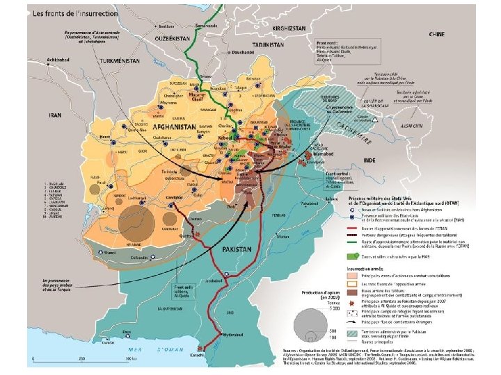 Le pays sous tension (1989 -2001) Kaboul 1989 Un gouvernement islamique modéré laissé par les soviétiques subsiste 1992 Un chef de guerre tadjik prend le pouvoir 1994 Les Talibans, pachtounes, commencent à s’emparer progressivement du territoire Ils viennent majoritairement des madrasas pakistanaises 1996 Il mettent en place un régime fondamentaliste sunnite à Kaboul