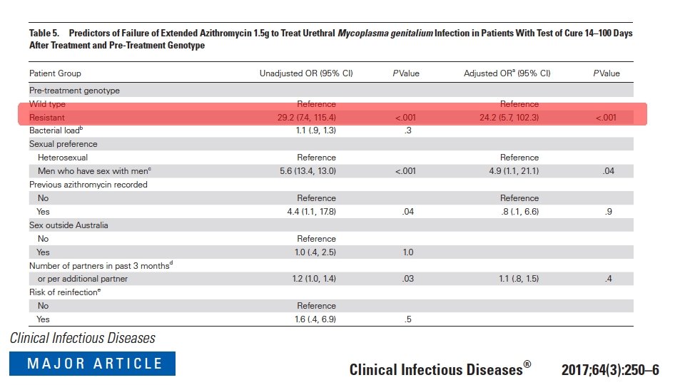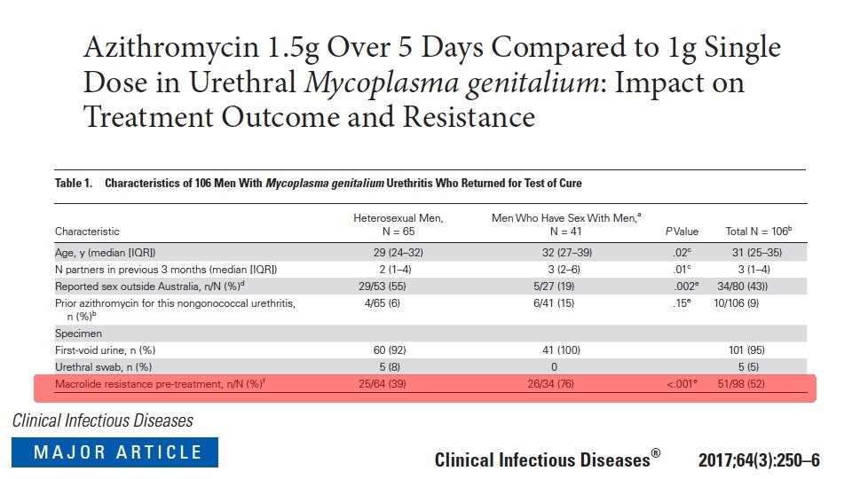• Infections à Mycoplasma genitalium • 10 à 35% des urétrites non gonococcique non chlamydia chez l’homme • Cervicites chez la femme • Résistance aux macrolides = 30 à 45% • notamment dans les régions ou ttt est azithromycine monodose