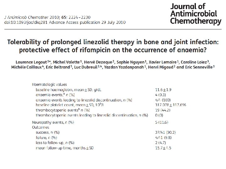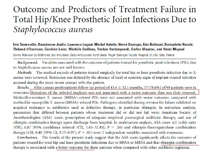 Efficacité lavage débridement fonction de l’âge de la prothèse et de la durée des symptômes Nombre de cas Délai d’inclusion Age de la PT Durée des symptômes Bactério. Efficacité Ref 19 cas 29 ans 2 mois-5 ans <10 j (1 -10) Mediane 4 j Strepto. peni. S 89. 5% 1 13/34 cas 21/34 cas 5 j 16 ans 12/34 1. 5 à 3 ans < 1 mois: 40% 11 ans 21/34 >1 mois: 60% 17/36 cas 19/36 cas 6 ans 23 > 1 an 11/33 cas 22/33 cas 13 < 1 an < 4 s 8 ans 1: Meehan, CID 2003(36: 845 -9) 2: Tattevin, CID 1999 (29: 292 -5) 3: Brandt, CID, 1997(24: 914 -9) > 4 s 100% Staph (75%) 2 54 j 0% < 2 j 100% Staph (93%) 3 0% > 2 j < 1 mois > 1 mois Variable 14 j Staph (86%) Staph (? %) 86. % * NS 27% 4 61% 5 4: RAO, Clin Ortho Rel Research, 2003(414: 55 -60) 5: Hartman, Clin Ortho Rel Research, 1991(273: 113 -8)