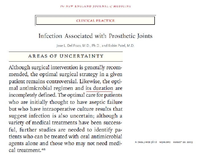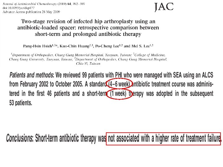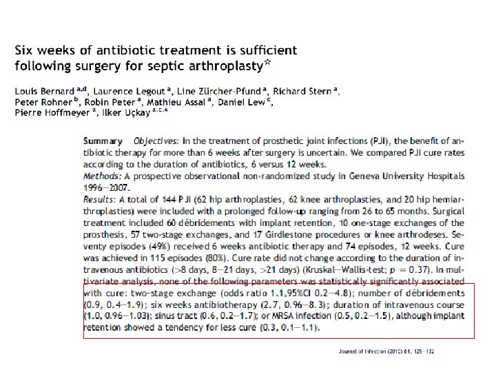 Recommandations • USA : en cours • Suisse (Zimmerli) : PTH 3 mois, PTG 6 mois • France : au moins 6 semaines ; justifier pour traitement >12 semaines si ostéo arthrite pas plus de 6 semaines Chez l’enfant : 3 semaines habituellement une étude récente validant 10 jours de traitement ATB