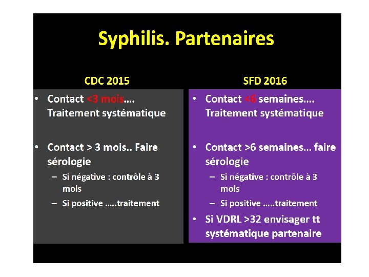 • Prise en charge thérapeutique : – Syphilis : péni G 24 MU/jour IV pdt 14 jours – Traitement et dépistage des partenaires