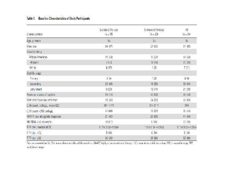 Single Dose Versus 3 Doses of Intramuscular Benzathine Penicillin for Early Syphilis in HIV: A Randomized Clinical Trial • Background. – Patients coinfected with syphilis and human immunodeficiency virus (HIV) may have a slower decrease in rapid plasma reagin (RPR) titers. Currently a single dose of 2. 4 million units of intramuscular benzathine penicillin G (BPG) is recommended for the treatment of early syphilis. Som. E observational studies have suggested that this regimen may lead to high failure rates in coinfected patients. • Methods. – We conducted an open-label randomized clinical trial to compare the efficacy of single-dose and 3 -dose regimens of BPG for the treatment of early syphilis in HIV-infected individuals. RPR titers were monitored every 3 months. Treatment success was defined as a decrease in RPR titers of ≥ 2 dilutions (4 -fold) during a 12 -month follow-up period