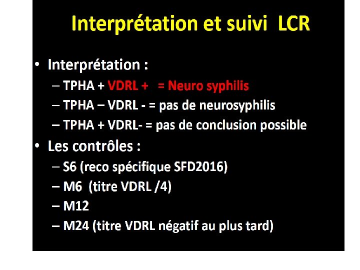 Indications de la PL dans la syphilis • Signes neurologiques: céphalées, vertiges , accouphenes , surdite • Manifestations ophtalmologiques • Allergie à la pénicilline : mauvaise diffusion des tétracyclines empêchant de recommander ces dernières dans le traitement alternatif des syphilis tardives sans avoir vérifier la normalité du LCR • Echec clinique, sérologique, thérapeutique • VIH + ? – (pour certains auteurs mais discuté) – SI CD 4 < 350 – ET VDRL > 32