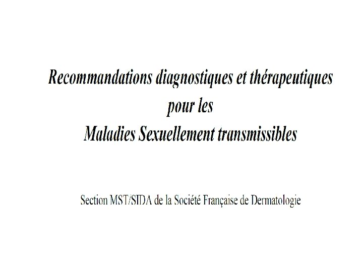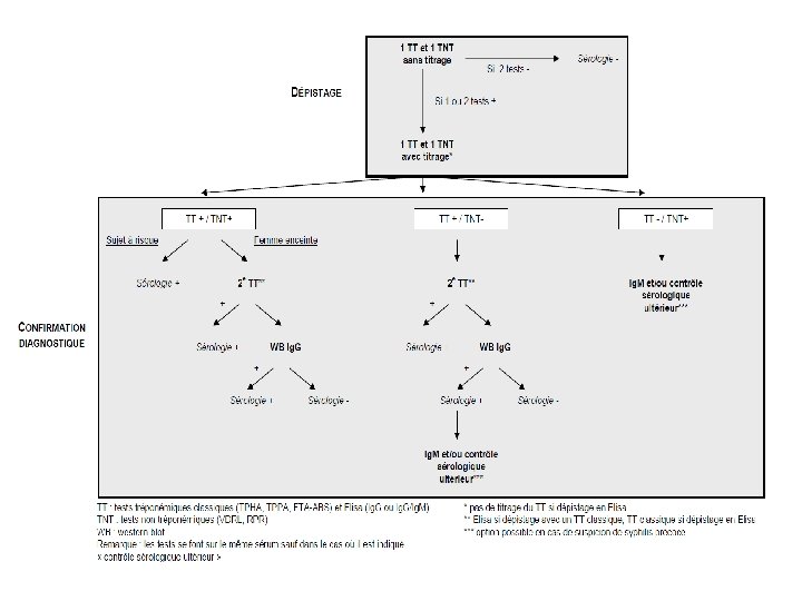 LES TESTS • Primary screening tests – Treponemal EIA/CLIA (preferably a test that detects both Ig. G and Ig. M) or TPPA, which is preferred to TPHA. – Request an anti-treponemal Ig. M test if primary syphilis is suspected. The clinical utility of the Ig. M test is limited by its suboptimal sensitivity and it should not be used to stage disease or decide the duration of treatment required. • Rapid treponemal tests might be useful is some outreach settings, provided positive results are confirmed by laboratory tests.