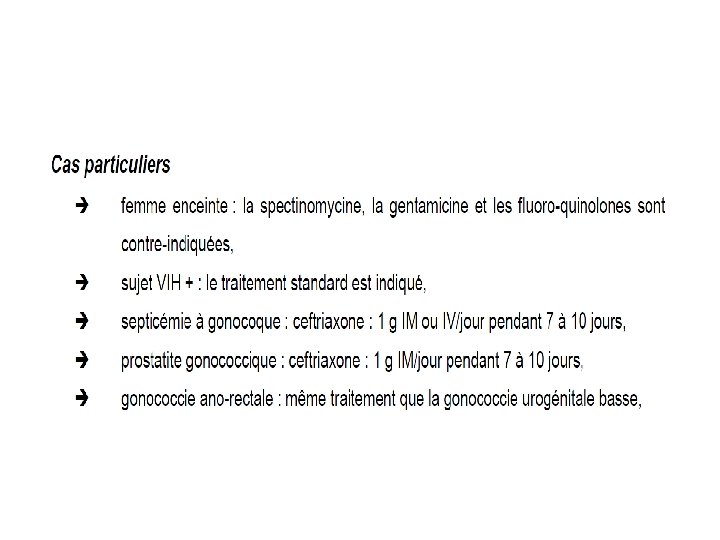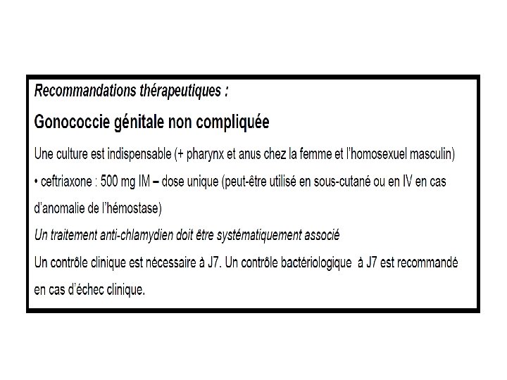 • Ce qui a été fait – Le 09/03/2017 : hémoglobine 14, 5 g/dl, globules blancs 1 900/mm 3, PNN 9 752/mm 3, plaquettes 403 000/mm 3, CRP 15 mg/l. – Sérologie VHB : antigène HBs négatif, anticorps anti-HBs à 10 UI/l, anticorps anti-HBc négatifs. – Sérologie VHC négative. – Sérologie VIH négative. – TPHA-VDRL négatif. – Sérologie Chlamydia trachomatis négative. – Ecouvillonnage urétral : urétrite à gonocoque (résistant aux fluoroquinolones), PCR Chlamydia négative.