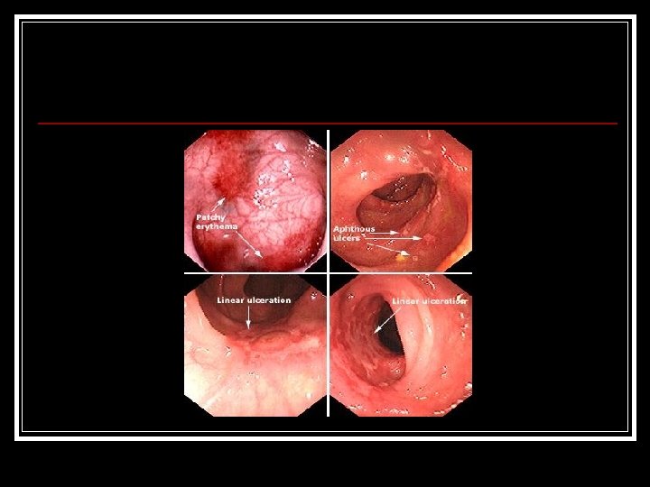 Cas clinique (001 -9) n Question n n 3/ Quelles sont les caractéristiques endoscopiques de la maladie de Crohn Réponse n Lésions macroscopiques à type de: n n n n n Ulcérations aphtoïdes Ulcérations en carte de géographie Pavage Erythème, œdème Pseudopolypes Sténoses Epaississement pariétal Fistule Distribution segmentaire, discontinue, transmurale Topographie n n Iléale : 30 à 40 % Iléo-colique : 30 à 50% Colique : 15 à 25 % Anale : 20 à 50 %