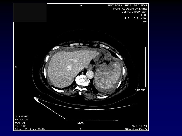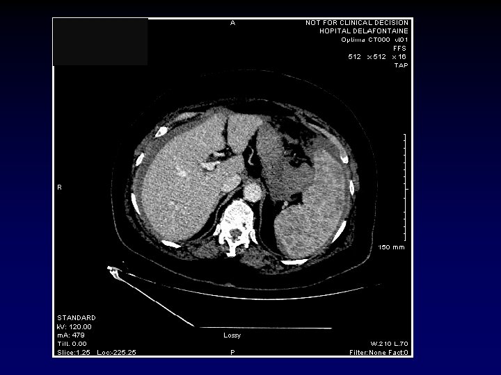 SCANNER ABDOMINAL AVEC IV le 07/01 Hématome avec aspect de fuite active au bord supéro-interne de la rate avec majoration de l’épanchement péritonéal et aspect de fuite active de contraste à deux niveaux Densité splénique hétérogène au temps portal prenant un aspect nodulaire