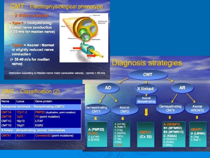 Ø L’examen EMG réalisé retrouve un aspect d’altération myélinique avec une augmentation des latences distales et un effondrement des VCN motrice et sensitive <30 m/s. l Question: En vous aidant de la classification suivante, pouvez vous préciser le type de CMT suspecté?