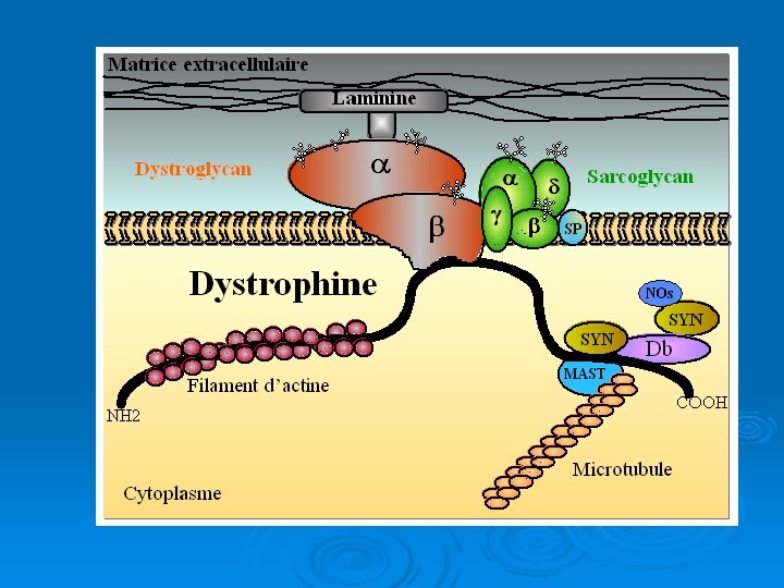 Aspect histologique en HE -Variation de la taille des fibres (nécrose/ régénération) -Centralisation nucléaire - Prolifération tissu collagénique Aspect en Western Blot - Bande spécifique de la dystrophine absente Immunohistochimie: absence du liseré au niveau de La mbr plasmique avec des Ac anti-dystrophine