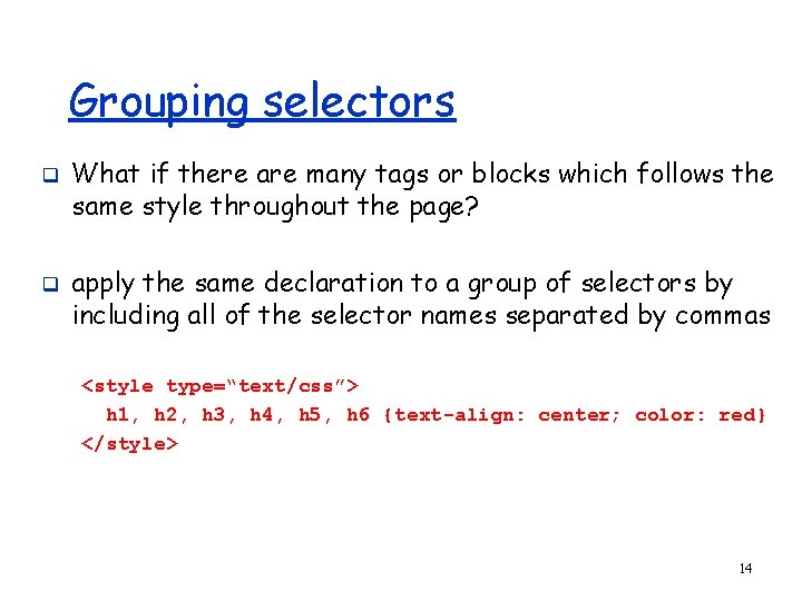 Grouping selectors q q What if there are many tags or blocks which follows the same style throughout the page? apply the same declaration to a group of selectors by including all of the selector names separated by commas <style type=“text/css”> h 1, h 2, h 3, h 4, h 5, h 6 {text-align: center; color: red} </style> 14