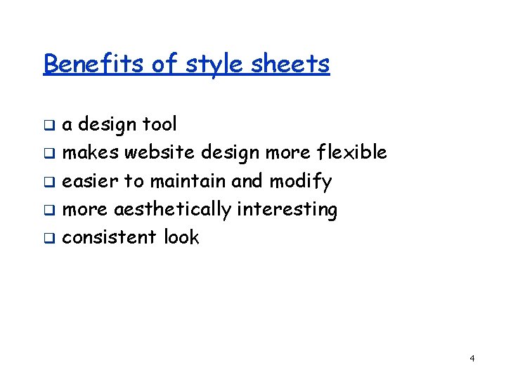Benefits of style sheets a design tool q makes website design more flexible q easier to maintain and modify q more aesthetically interesting q consistent look q 4