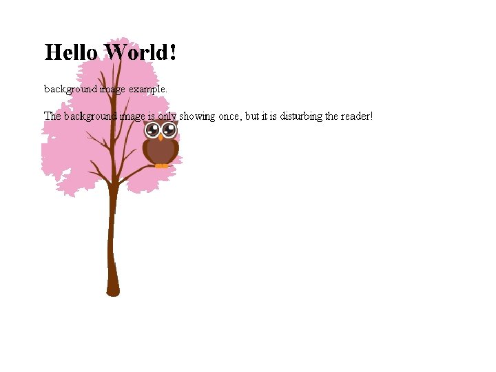 <body> <h 1>Hello World!</h 1> <p> background image example. </p> <p>The background image is only showing once, but it is disturbing the reader!</p> </body> </html>