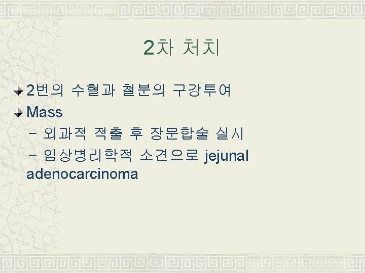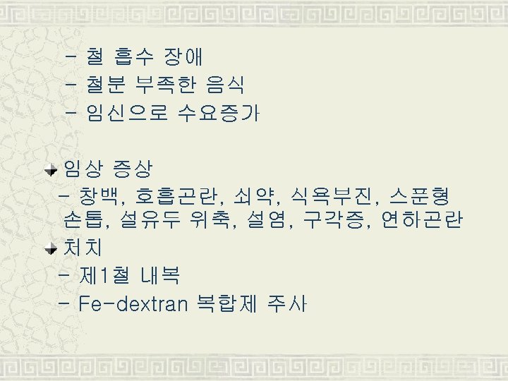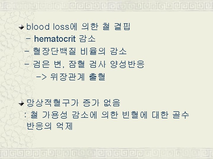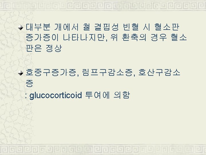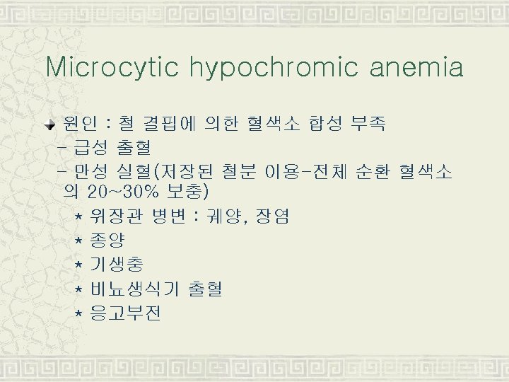 Case 3 Iron Deficiency Anemia in Dog fecal Slides: 14 Download presentation Case 3. Iron Deficiency Anemia in Dog 전북대학교 수의과대학 고양숙 분변부유법(fecal flotation) : Trichuris ova 미량 잠혈검사(fecal occult blood test) : 양성 뇨검사 : 정상 골수검사 - M: E비(myeloid : erythroid) : 1. 6 - stainable iron은 관찰되지 않음 위장관 barium 조영 : 장관내 mass Parameter 10. 4 5. 23 Reference range Erythrocytes RBC count (106/㎕) Hemoglobin (g/㎗) 15. 2 1. 8 6. 55 12. 6 5. 5~8. 5 12. 0~18. 0 7 46 26 12 52 36 55 35 19 40 37~54 62~74 32~36 22~27 <80 4+ 2+ Slight slight None none Hematocrit (%) MCV (fl) MCHC (%) MCH (pg) Reticulocytes(? 03/ ㎕) Hypochromasia Poikilocytosis 10. 4 5. 23 Reference range 15. 2 7. 6 6. 0~17. 0 0 0. 1 0~0. 3 Neutrophils 14. 0 5. 2 3. 0~11. 5 Lymphocytes 0. 3 1. 0~4. 8 Monocytes 0. 6 1. 0 0. 1~1. 3 Eosinophils 0 0. 2 0. 1~1. 2 Basophils 0 0 <0. 1 Parameter Leukocytes (103/㎕) Band neutrophils Parameter 10. 4 5. 23 Reference range Other tests Plasma proteins (g/ ㎗) Fibrinogen (㎎/㎗) 5. 2 6. 7 6. 0~7. 8 100 100~400 Icterus index (units) <5 <5 <5 Platelets (? 03/㎕) 342 250 160~430 Iron (㎎/㎗) 17 84~233 TIBC (㎎/㎗) 357 284~572 Saturation (%) 4. 8 19. 6~59. 3 Interpretation Microcytic hypochromic anemia : 만성 철 결핍성 빈혈 - serum iron 감소, 정상적인 TIBC, Fe 포화 도 감소, 골수 내 stainable iron의 결핍 => 철결핍 - RBC 수 증가, 낮은 PCV치와 MCV치 - 낮은 MCHC, MCH