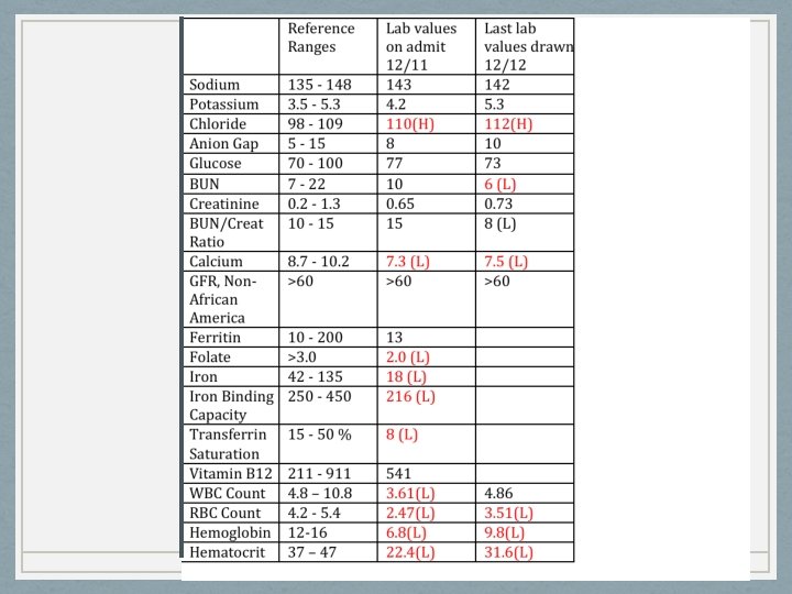 Nutrition-Related Problems & Evidence • Malnutrition • Visible muscle wasting, fat store loss, weight loss, poor intake • Altered nutrition-related lab values: • Iron • Calcium • H&H • Underweight • BMI • Inadequate intake • Weight loss • Per patient • Undesirable food choices • Per 24 -hr recall • Per patient