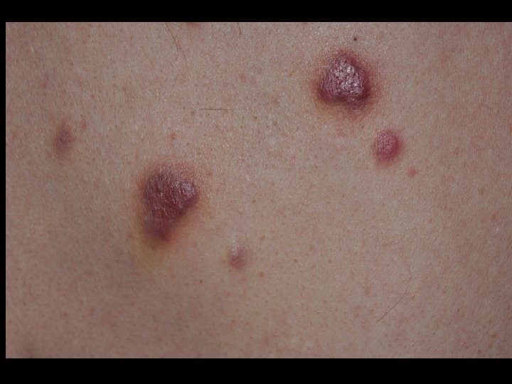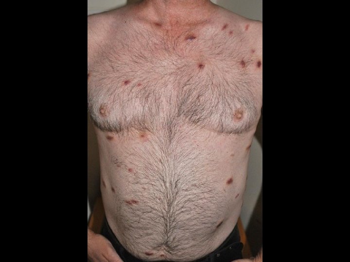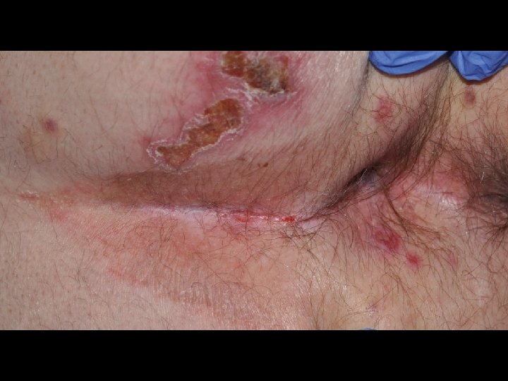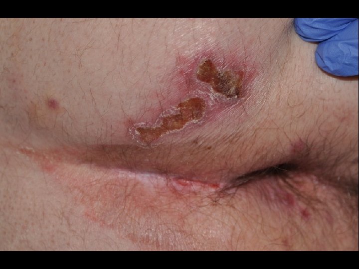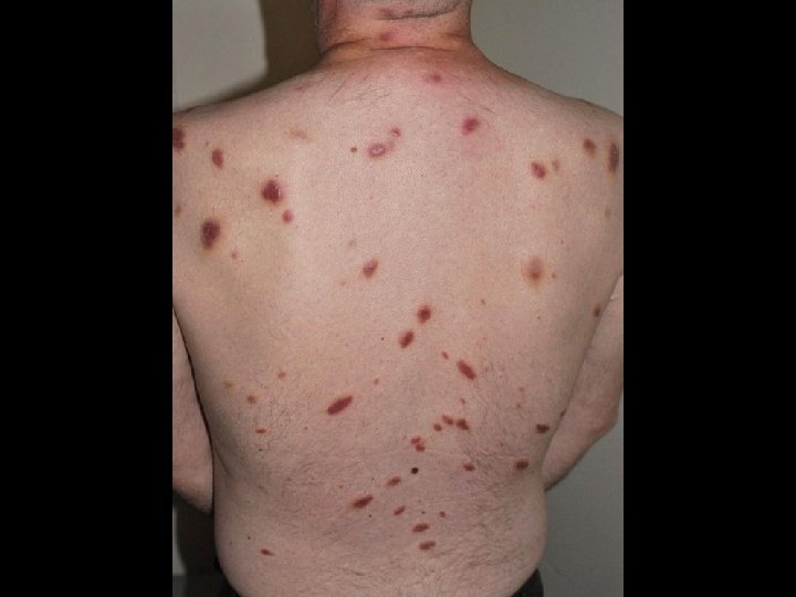 CASE OF THE MONTH: Kaposi's Sarcoma and the rest. . . Telephone call from Dr Mark Griffiths at 8. 00 am Friday morning to Dr O’Mahony: “Saw a patient last night in clinic. Looks like Kaposi’s Sarcoma to me. I’ve been to enough of your talks to recognise it! I have asked him to come in this morning at 9. 00 am and we’ll do some bloods. ” I said, “No need, tell him to come straight to us. ” On examination, he had multiple lesions of Kaposi’s Sarcoma all over the trunk, also ominously including the palate. He is a gay man from down south, visiting parents in Chester. Dr Griffiths had put him on Flucloxacillin as there was a large oozing lesion on the right buttock. I did a full STD screen including swabs for syphilis and herpes from the oozing lesion and anal margins. I told the patient it was HIV related Kaposi’s Sarcoma. I telephoned him later, as arranged, to tell him about his positive HIV test and also syphilis. Hep B core also positive. Also noted, was neutropenia and Gamma GT of nearly 1000 and he has a history of alcohol abuse. I saw him again on Monday morning and he was given Benzathine Penicillin for syphilis. The buttock lesion had improved enormously and was now dry and crusted (see image).