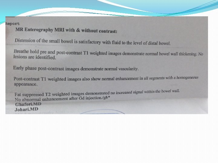 Report colonoscopy Anus: NL Rectum and sigmoid : NL Descending and ascending colon: decrease vascular pattern and there was aphtus ulcer like lesion was seen Cecum and ileusecal: NL