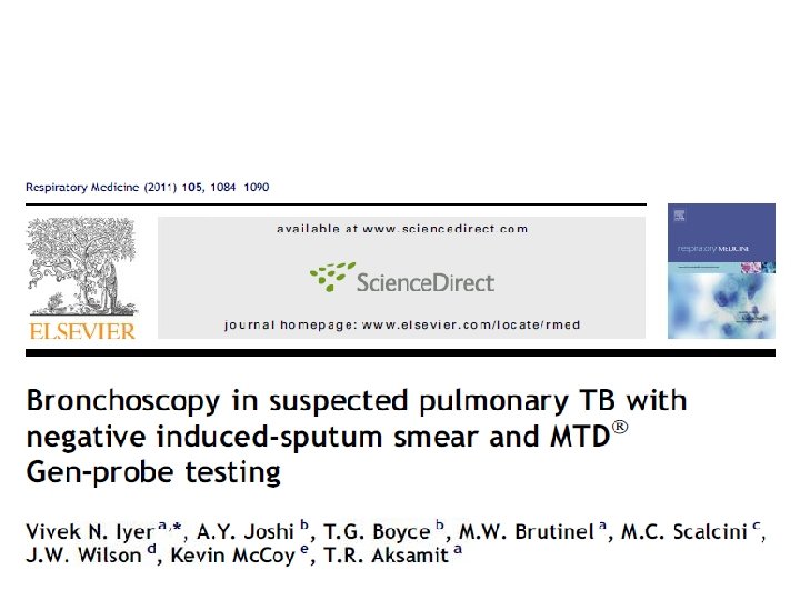 • Those with negative induced-sputum results still suspected with TB are then referred for bronchoscopy • 30 suspected cases: Induced sputum smear/culture 60 days BAL culture + 3/30 (10%) BAL smear + none BAL NAA + none