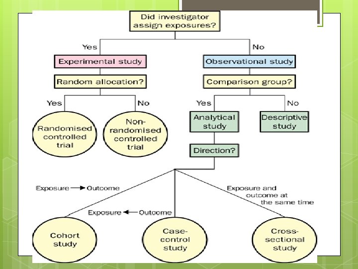 Cross-sectional studies • Cross-Sectional Studies measure existing disease and current exposure levels. • They provide some indication of the relationship between the disease and exposure or non-exposure • Mostly prevalence studies/surveys