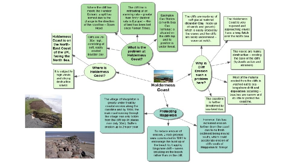 Holderness Coast Where is the Holderness Coast? What is the problem? • Holderness Coast is on the NE coast of the UK, facing the North Sea • Mainly made up of cliffs (20 -30 m high), consisting of soft, easily eroded boulder clay. • Where the cliff line meets the Humber Estuary, a spit has formed due to the change in the direction of the coastline – Spurn Head. • The cliff line is retreating at an alarming rate – greater than 1 m/yr (fastest rate in Europe) – 4 km of land has been lost since Roman Times. • Easington Gas Station (a North Sea Gas Terminal) is situated on the cliffs top and its position is under threat. Why is Cliff Erosion such a problem here? • The cliffs are made up of soft glacial material (Boulder Clay- made up of sands and gravels) which is easily eroded by the waves and the cliffs are easily undermined – wave cut notch. • The Holderness Coast is very exposed and approaching waves have a long fetch over the North Sea. • The waves are mainly destructive – eroding the base of the cliffs (hydraulic action and abrasion). • Most of the material eroded from the cliffs is washed out to sea – longshore drift and deposition occurring – beaches are narrow and do little to protect the coastline. • The coastline is further threatened by sea-level rise. Protecting Mappleton: The village of Mappleton is greatly undertreat by coastal erosion along the coastline and by 1998, the main road running through the village was only 500 m from the cliff top (in places now only 50 m). Suffers erosion up to 2 m per year. To reduce amount of erosion, 2 rock groynes were constructed in 1991 to encourage the build up of the beach by trapping longshore drift – waves breaking on the beach rather than on the cliff. However, this has increased erosion further down the coast due to no fresh sediment being moved south, which could accelerate erosion of cliffs south of Mappleton to 10 m/yr.