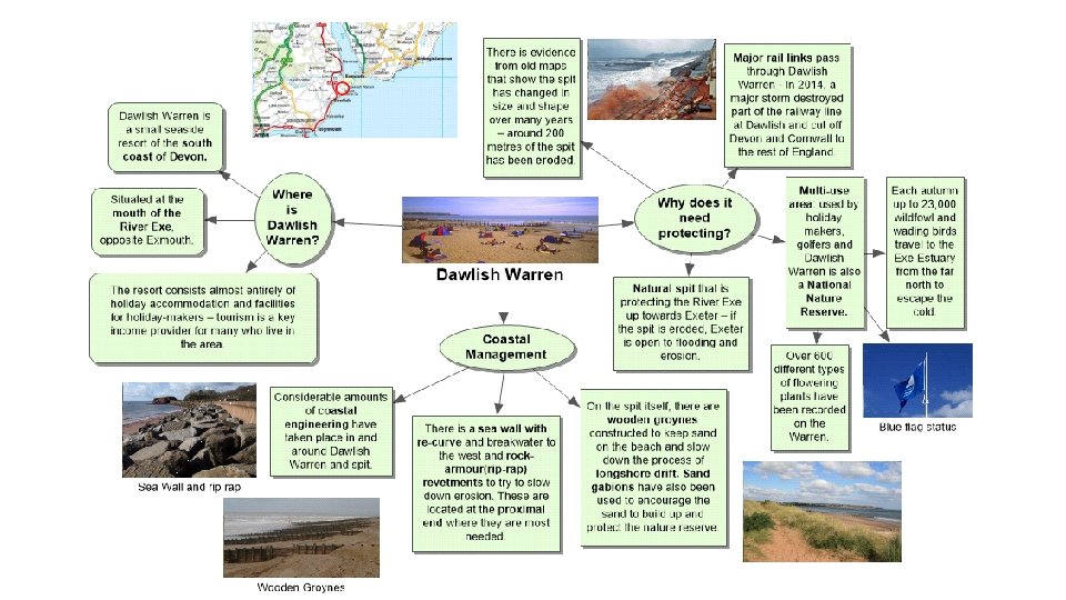 Dawlish Warren Where is Dawlish Warren? • Dawlish Warren is a small seaside resort of the south coast of Devon. The resort consists almost entirely of holiday accommodation and facilities for holiday-makers – tourism is a key income provider for many who live in the area. • Situated at the mouth of the River Exe, opposite Exmouth. Why does it need protecting? • There is evidence from old maps that show the spit has changed in size and shape over many years – around 200 metres of the spit has been eroded. • Major rail links pass through Dawlish Warren - In 2014, a major storm destroyed part of the railway line at Dawlish and cut off Devon and Cornwall to the rest of England. • Multi-use area: used by holiday makers, golfers and Dawlish Warren is also a National Nature Reserve. • Natural spit that is protecting the River Exe up towards Exeter – if the spit is eroded, Exeter is open to flooding and erosion. Coastal Management: - Considerable amounts of coastal engineering have taken place in and around Dawlish Warren and spit. - There is a sea wall with re-curve and breakwater to the west and rock-armour(rip-rap) revetments to try to slow down erosion. These are located at the proximal end where they are most needed. - On the spit itself, there are wooden groynes constructed to keep sand on the beach and slow down the process of longshore drift. Sand gabions have also been used to encourage the sand to build up and protect the nature reserve.