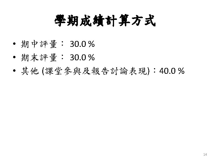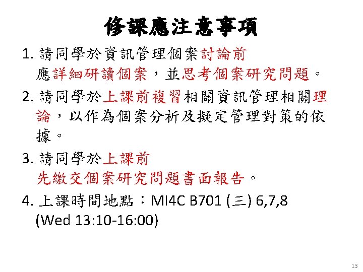 教材課本與參考書籍 • 教材課本 (Textbook) • Kenneth C. Laudon & Jane P. Laudon (2012), Management Information Systems: Managing the Digital Firm, Twelfth Edition, Pearson. – 參考書籍 (References) • 周宣光 譯 (2011), 資訊管理系統-管理數位化公司, 第 12版,東華書局 12