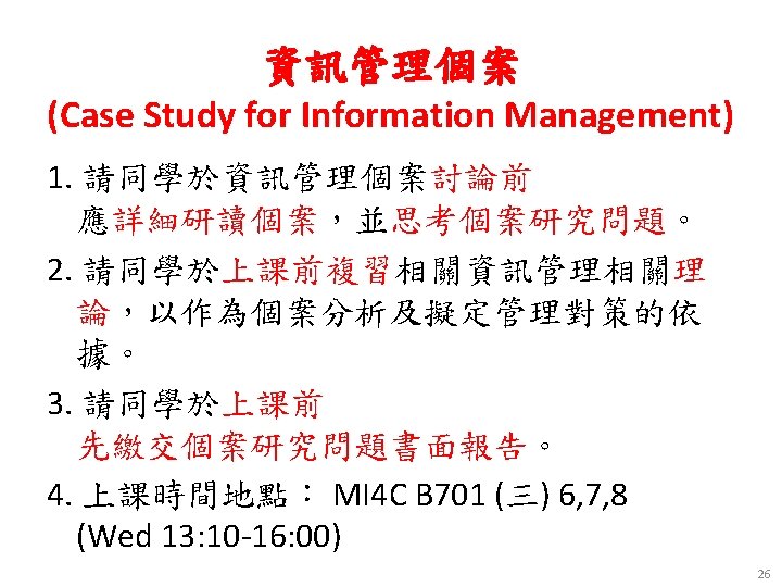 課程大綱 (Syllabus) 週次 日期 1 102/09/18 2 102/09/25 3 102/10/02 內容(Subject/Topics) Introduction to Case Study for Information Management Information Systems in Global Business: UPS (Chap. 1) Global E-Business and Collaboration: NTUC Income (Chap. 2) 4 102/10/09 Information Systems, Organization, and Strategy: i. Pad and Apple (Chap. 3) 5 102/10/16 IT Infrastructure and Emerging Technologies: Salesforce. com (Chap. 5) 6 102/10/23 Foundations of Business Intelligence: Lego (Chap. 6) 9