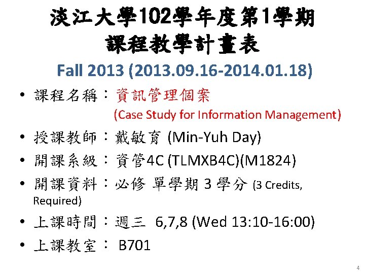 Case Study for Information Management 資訊管理個案 Introduction to Case Study for Information Management 1021 CSIM 4 C 01 TLMXB 4 C (M 1824) Wed 6, 7, 8 (13: 10 -16: 00) B 701 Min-Yuh Day 戴敏育 Assistant Professor 專任助理教授 Dept. of Information Management, Tamkang University 淡江大學 資訊管理學系 http: //mail. tku. edu. tw/myday/ 2013 -09 -18 1