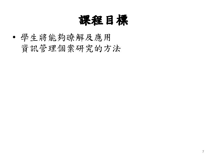 Course Introduction • This course helps students to understand analysis the direct connection between information systems and business performance though case study. • It helps students a better understanding of how specific companies use information systems to achieve the main business objectives: – – – operational excellence, new products and services, customer and supplier intimacy, improved decision making, competitive advantage, and survival. 6