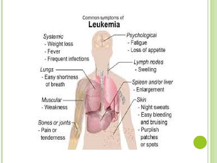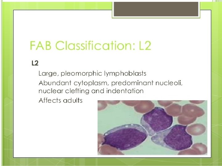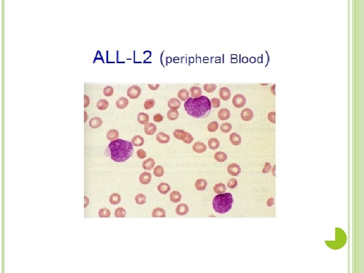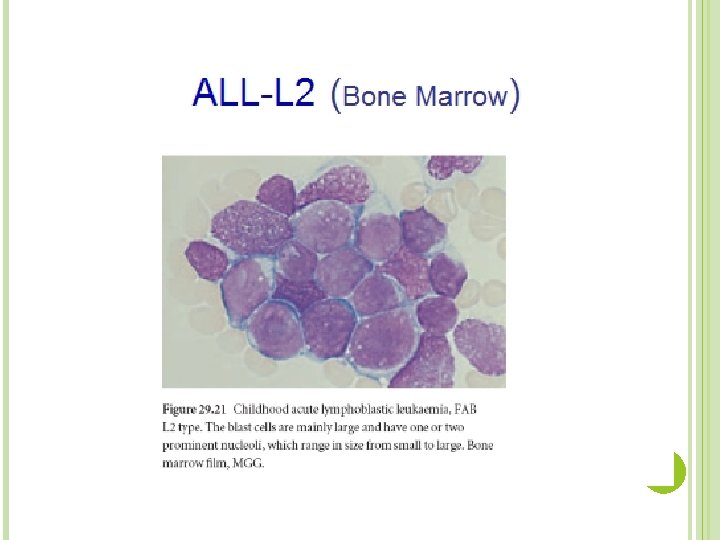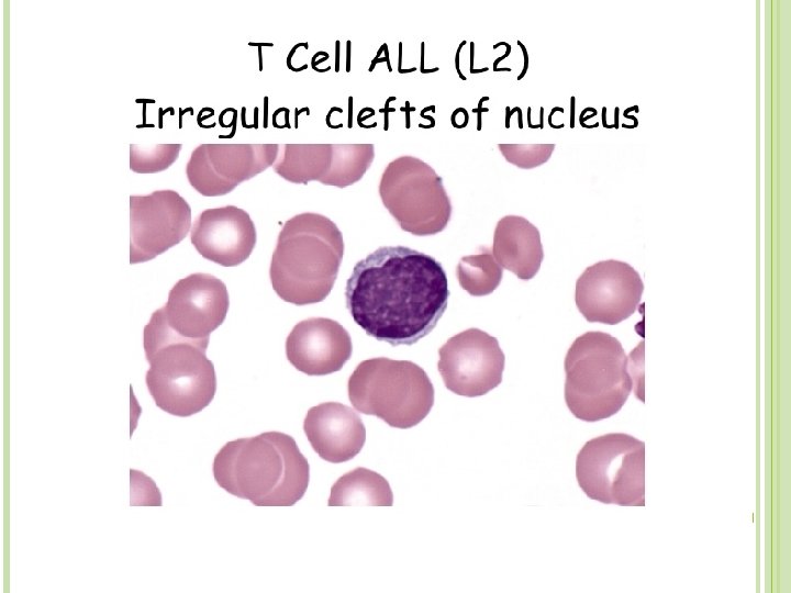 L 2 (ALL) Heterogeneous population of large lymphoblasts with moderately abundant cytoplasm & or more nucleoli. Nucleus commonly intended or cleft. Incidence – ALL is primarily a disease of young children (2 -5 years), but it can also occur in adults Clinical findings – pancytopenia with resulting fatigue, pallor, fever, weight loss, irritability, anorexia, infection, bleeding, and bone pain. L 1 occurs in children, L 2 in adults, and L 3 is called Burkitts leukemia