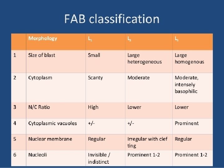 Classification of leukemia Main classification Acute leukemia Chronic leukemia FAB Lymphoid Myeloid Lymphoid Myeloid L 1 L 2 L 3 AML M 0 M 1 M 2 M 3 M 4 M 5 M 6 M 7