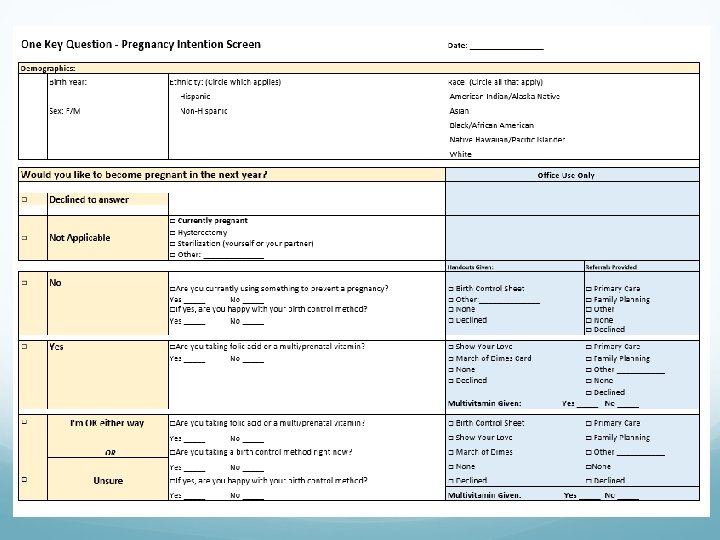 Jackson & Josephine Co. WIC Data 1908 women screened Oct. 2014 – Apr. 2015 Would you like to become pregnant in the next year? No = 54% Yes = 8% OK either way = 7% Not Applicable = 33%