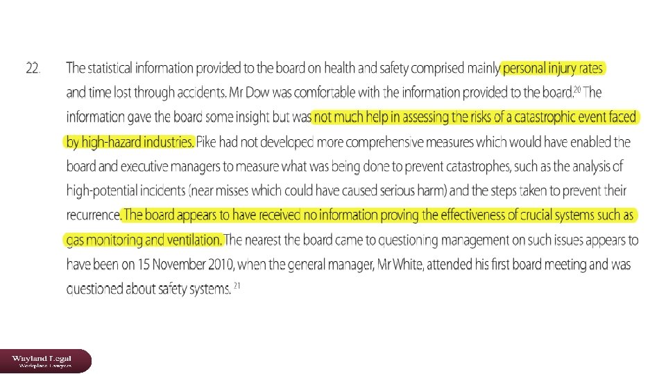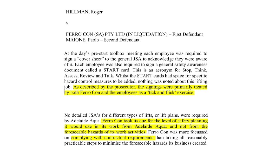 Orr v Hunter Quarries Pty Limited [2019] NSWDC 634 "The prosecutor submitted that the safety documentation at the quarry was a confused and chaotic system. Certainly the defendant could not produce a complete and seamless collection of written safety documents. However, all the safety documentation in the world is of little use unless workers are trained in matters of safety, and safe working practices are then constantly observed* and enforced. “ *followed