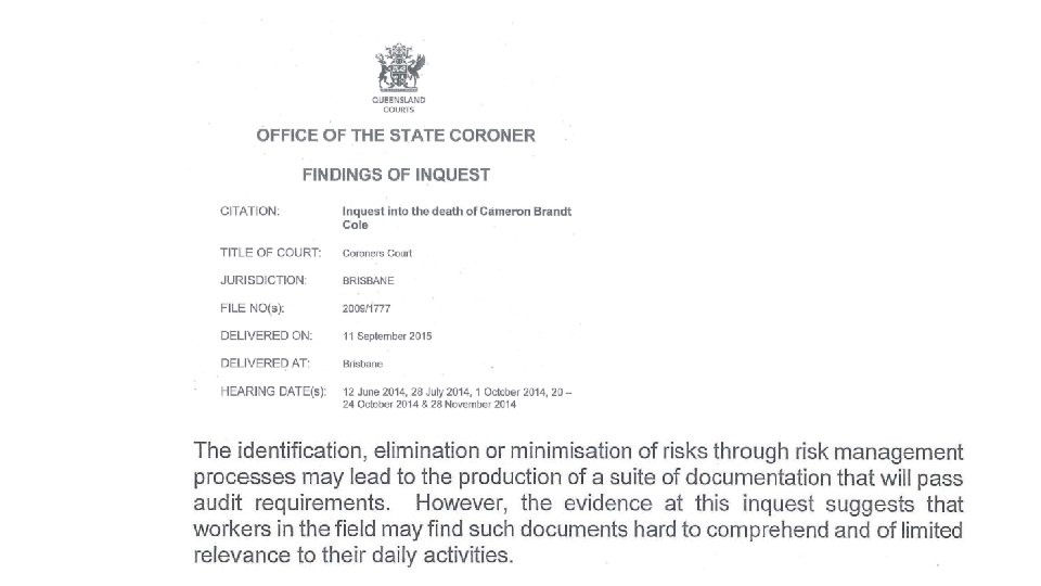 Case System Application Findings Desai No written system On the job training Buddy system Hazards not known Controls not understood or implemented Guilty Wollongong Glass No written system On the job training Buddy system Hazards and controls known Controls understood and implemented Not guilty Fry v Keating System of work but not provided On the job training Hazards known Controls not understood or implemented Guilty SD Tillett No evidence of written system On the job training Hazards and controls known Controls understood and implemented Not guilty Harris v Coles Sophisticated written system Online training Documented training records Hazards and controls not understood Controls not implemented Negligent