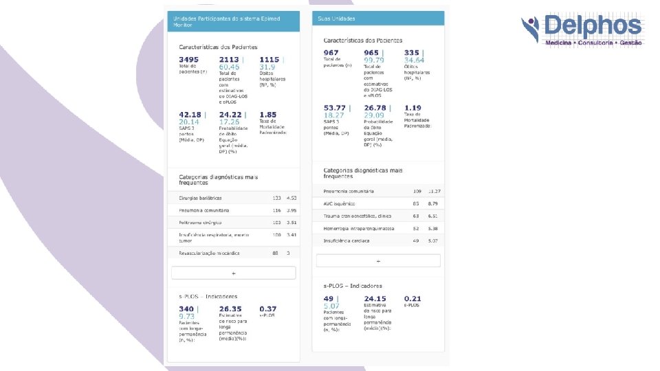 S-PLOS Ferramenta Epimed LOS UTI de adultos 20 leitos no interior da Amazônia Índice de gravidade SAPS 53, 8 (42, 6 da Rede) Taxa de mortalidade = 34, 6% (16, 5% na Rede) Expectativa de 24, 15% internação prolongada (17, 74% na Rede)