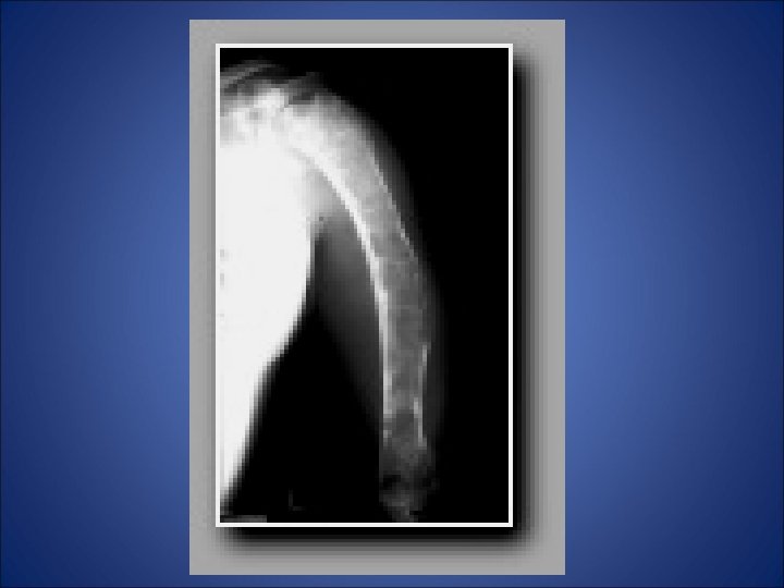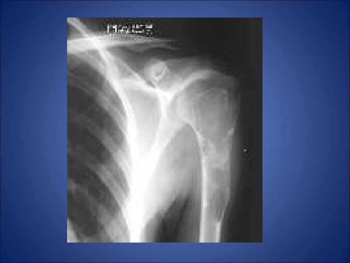 • RADIOLOGY: • Plain film: Characteristic location as described above. The classic plain film location is of a centrally located, mildly expansile, lytic lesion. • Some simple bone cysts may appear multiloculated and a thin sclerotic margin is usually present. With pathologic fracture the "fallen fragment" sign is a classic. • CT: May better delineate the extent of the lesion. Reports of gas within cysts detected at CT have occurred ("pneumatocysts") with gas-fluid levels. • Tc 99 Scintigraphy: Heterogeneous increase in activity involving the proximal third of the left humerus. • MRI: (HUMERUS) An expansile, lobulated lesion is present involving the metaphysis and proximal humeral shaft. The signal is T 1 WI dark and T 2 WI bright, uniformly and there is no evidence of enhancement.