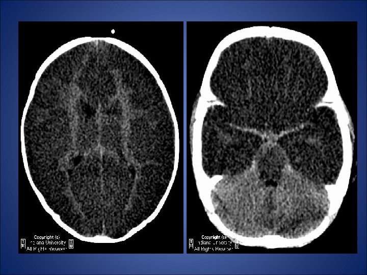 1. Initial axial CECT scan 24 hours after delivery shows diffuse low density in the cerebral hemispheres. The cerebellum appears comparatively hyperdense, the so called- reversal sign. 2. NCCT scan after 5 days shows enlarged ventricles and low density hemispheres without gray-white matter differentiation.