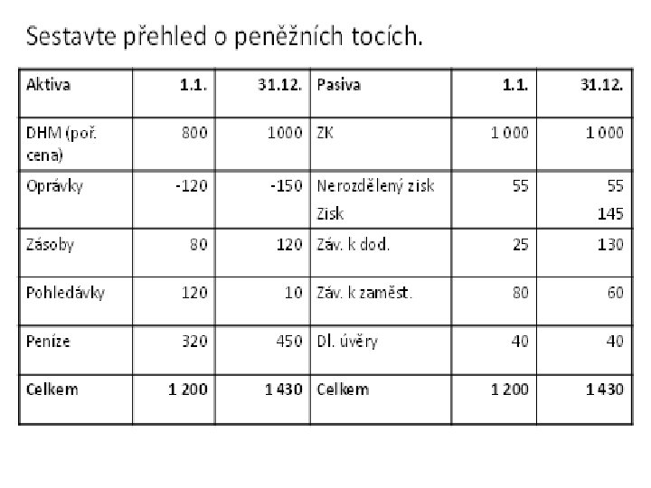 Pamatuj! • Zvýšení jakékoliv položky aktiv (kromě peněžních prostředků) vyvolá …. ? • snížení peněžních prostředků (- peněžní tok) • Snížení jakékoliv položky aktiv (kromě peněžních prostředků) vyvolá …. . ? • zvýšení peněžních prostředků (+ peněžní tok) • Zvýšení jakékoliv položky pasiv vyvolá…? • zvýšení peněžních prostředků (+ peněžní tok) • Snížení jakékoliv položky pasiv vyvolá …. ? • snížení peněžních prostředků (- peněžní tok)