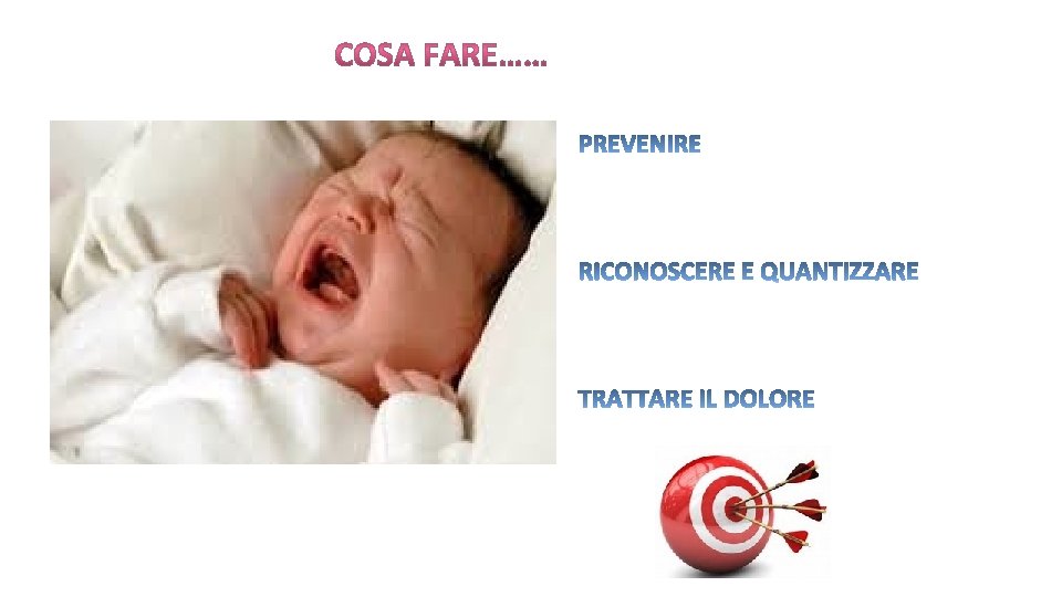Un dolore non riconosciuto e non trattato in epoca neonatale può avere gravissime conseguenze a breve e lungo termine È doveroso quantizzare e monitorare il dolore nei neonati attraverso delle scale L’analgesia non farmacologica è utile soprattutto in caso di dolore lieve-moderato Il trattamento del dolore severo prevede una specifica terapia farmacologica