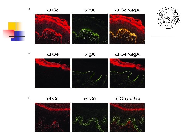 Consulenza dermatologica n L’esame delle lesioni vesciculo-papulose agli arti superiori ed al tronco sembrerebbe suggestivo, anche sulla scorta dei dati anamnestici, di dermatite erpetiforme (m. di During). Utile biopsia per valutazione della giunzione dermo – epidermica. Esame istologico con immunofluorescenza: Alla giunzione dermo-epidermica numerosi depositi granulari di immunoglobuline di tipo A come da dermatite erpetiforme.