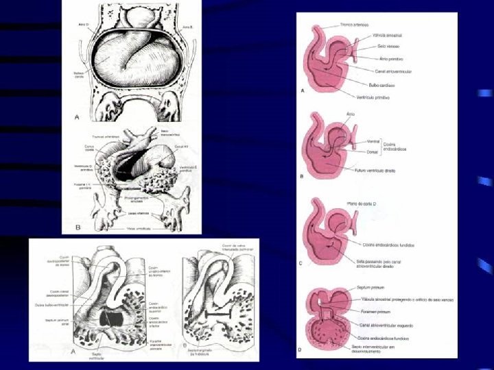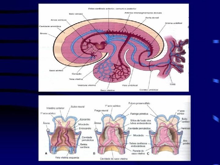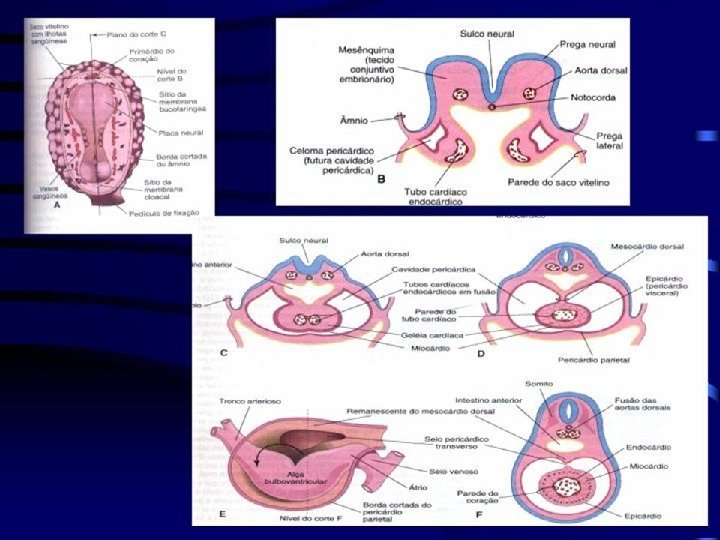 EMBRIOLOGIA • Sistema cardiovascular – 1 o grande sistema a funcionar no embrião – Deriva principalmente do mesoderma esplâncnico • Desenvolvimento Inicial – 3 a semana – Cordões angioblásticos – mesoderma esplâcnico – Tubos endocárdicos do coração • Fusão – coração tubular ( final da 3 a semana ) • Camadas: tubo endotelial ( endocárdio ), geléia cardíaca, miocárdio, pericárdio viceral ou epicárdio – 21 o dia começa a bater