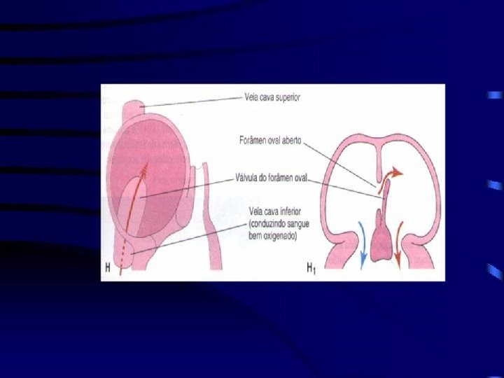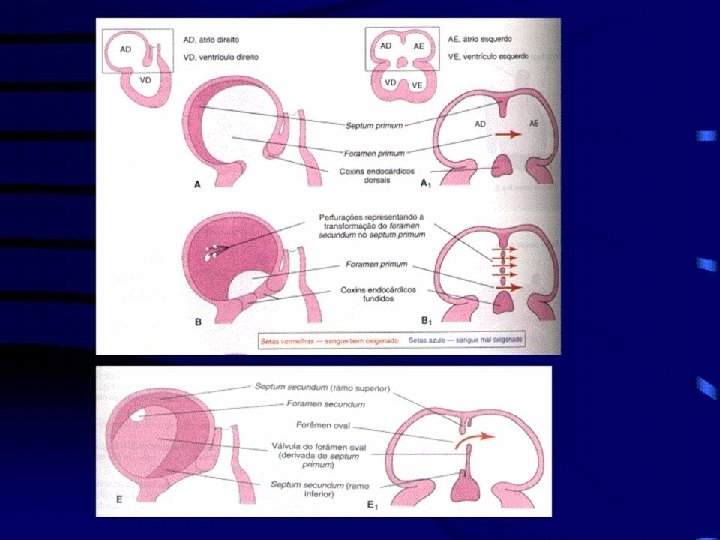 Septação do Coração • Meio da 4 a ao final da 5 a semana • Septação do canal AV – Coxins endocárdicos ventral e dorsal – Participa na septação atrial e ventricular • Septação do átrio primitivo – – – Septum Primum Ostium Secundum Septum Secundum Forâmen Oval